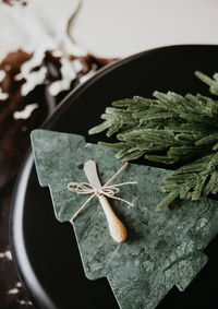 A festive and elegant green marble tree shaped cheese and cutting board with canape knife. The board is made of marble, with a smooth and durable quality. The board also includes a stainless steel and mango wood canape knife that matches the board and is easy to use and clean. A perfect piece to serve cheese, bread, fruits, or other snacks in style. Hand wash only.