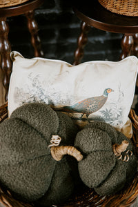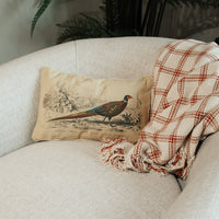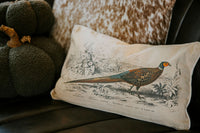 Rooted in rustic charm, this lumbar pillow features a vintage-style pheasant illustration on a natural-toned cotton base. Perfect for fall transitions, lodge-inspired displays, or heritage-style home accents, each pillow adds a quiet sophistication to chairs, benches, or layered pillow pairings. Finished with subtle piping for a polished look.